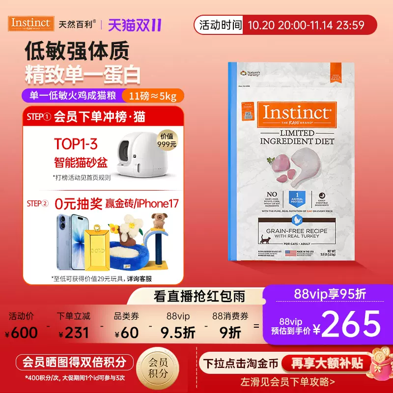 CatFans 9折消费券 https://s.click.taobao.com/BmLGUlp 百利低敏火鸡成猫粮11磅 需楼上9折券 详情页领600-60券 右上角[•••]-点"淘金币 88vip💰165 https://s.catfans.club/747